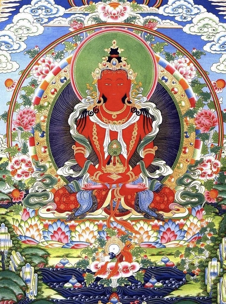 长寿佛又名无量寿佛,无量之意为不可计数、广大无边,乃是法身阿弥陀佛以报身佛呈显的另一种形相。主司众生所畏惧之魔障、死神,而护佑有情得自在,与白度母、尊胜佛母被认为是福寿吉祥的象征,合称长寿三尊。